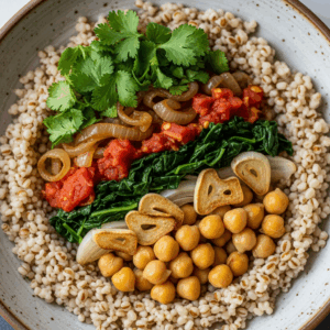 4. Add Greens and Chickpeas: Mix in chopped kale or spinach, sautéing until wilted, about 3 minutes. Then fold in cooked chickpeas if using, warming through gently.