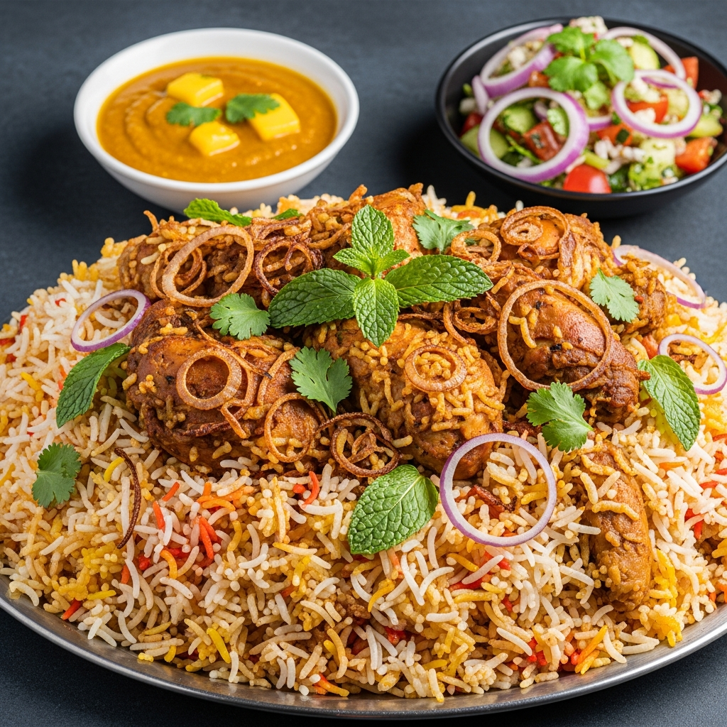 What truly defines this biryani is its bold and balanced spice palette. The marriage of cinnamon sticks, green cardamom pods, cloves, star anise, and black peppercorns creates a warm backdrop. Complementing these are fresh aromatics like ginger, garlic, and onions, which build the base.Jasmine or basmati rice absorbs the rich flavors, while the tender chicken offers a fluffy, succulent bite. Saffron or turmeric imparts a golden hue, enhancing both appearance and taste.
