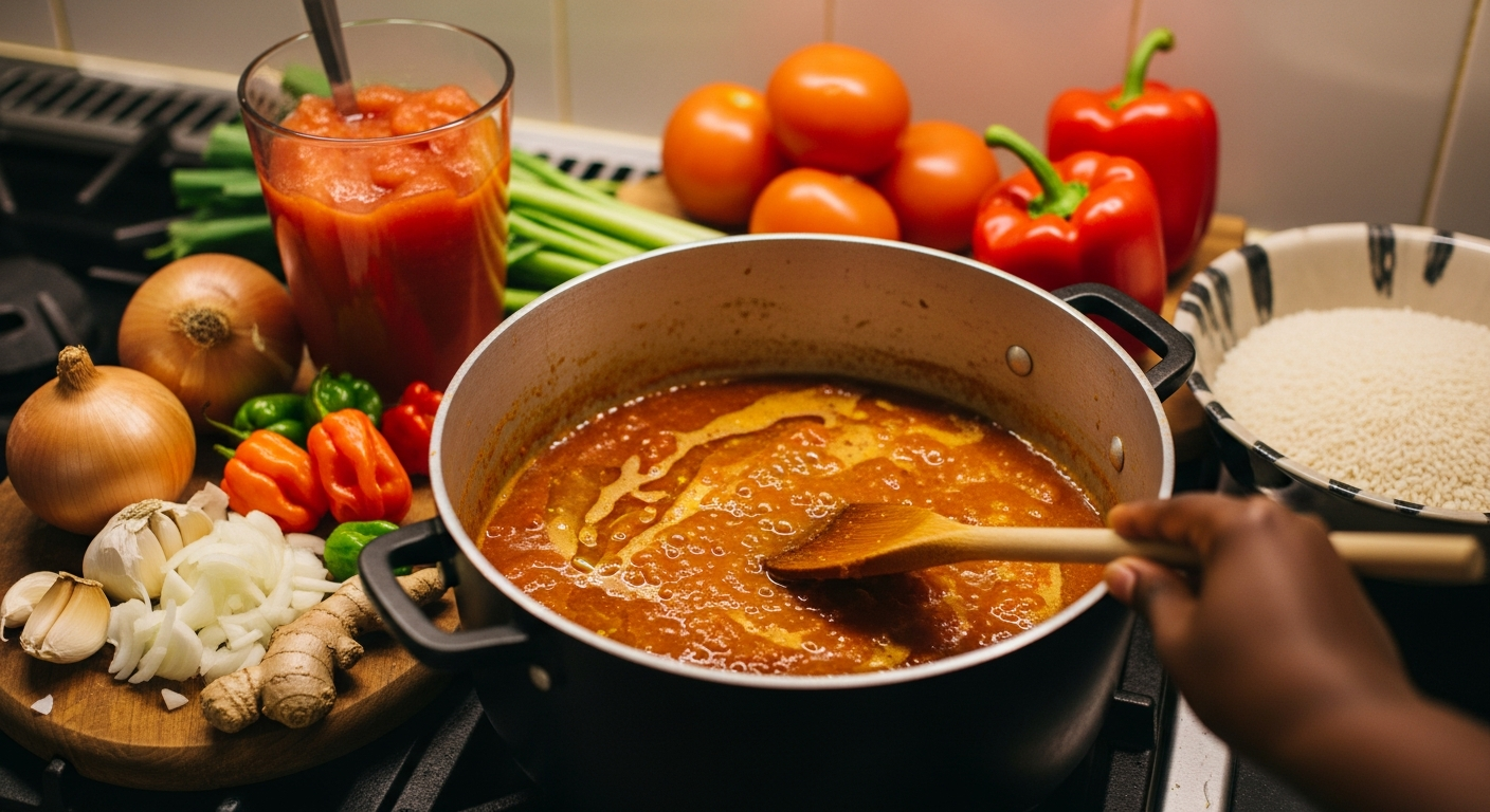 - Cook the tomato base: Pour in the blended tomatoes, red bell pepper, and tomato paste. Add the chopped Scotch bonnet peppers, smoked paprika, and thyme. Reduce heat to medium-low and simmer for 15-20 minutes, stirring occasionally, until the sauce thickens and the oil begins to separate.